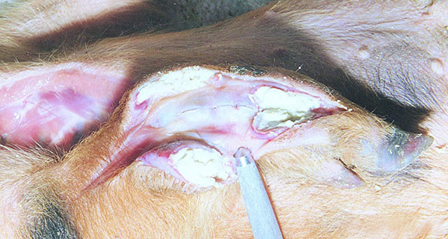 4. 豬腫大的關(guān)節(jié)皮下有膠樣水腫,關(guān)節(jié)囊內(nèi)有黃色膠凍樣液體。
