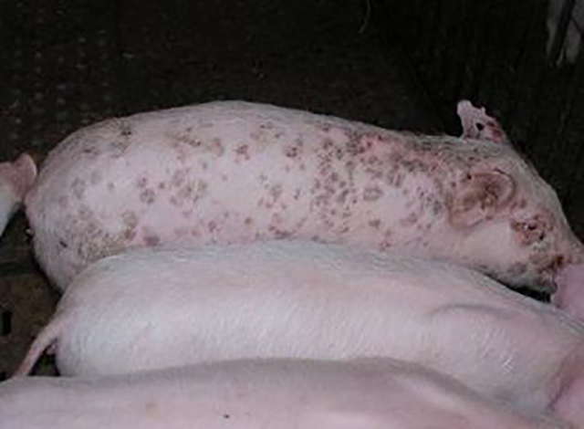 2、豬痘中間凹陷,周圍凸起,遍布全身,病初豬皮膚出現(xiàn)紅斑,然后發(fā)展成丘疹,慢慢形成水泡,最后膿包破潰,形成痂皮。